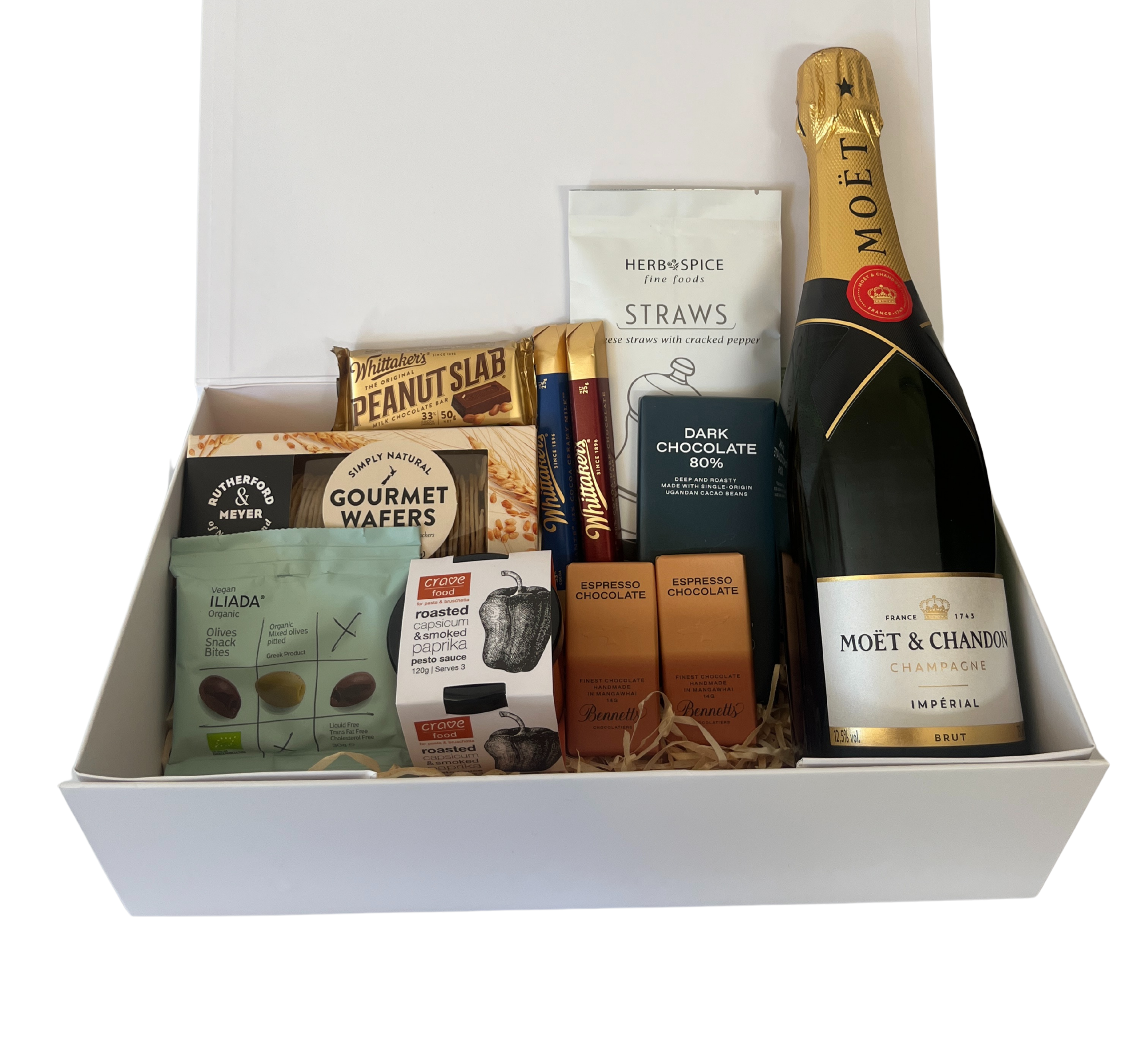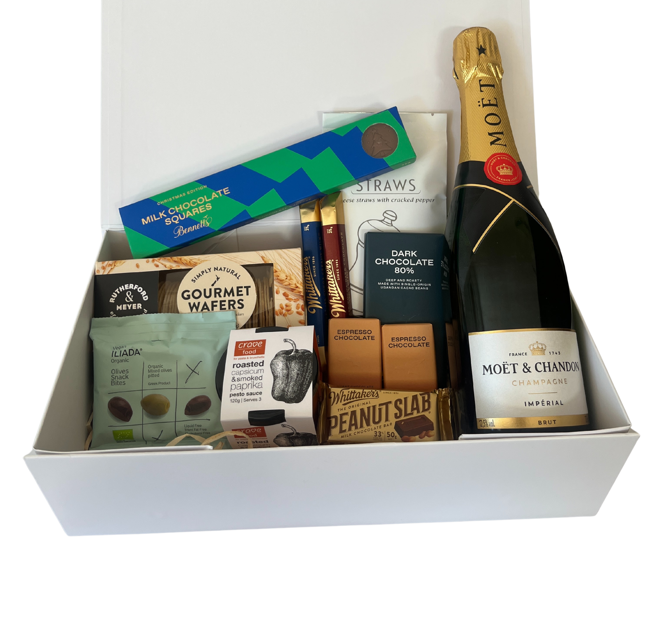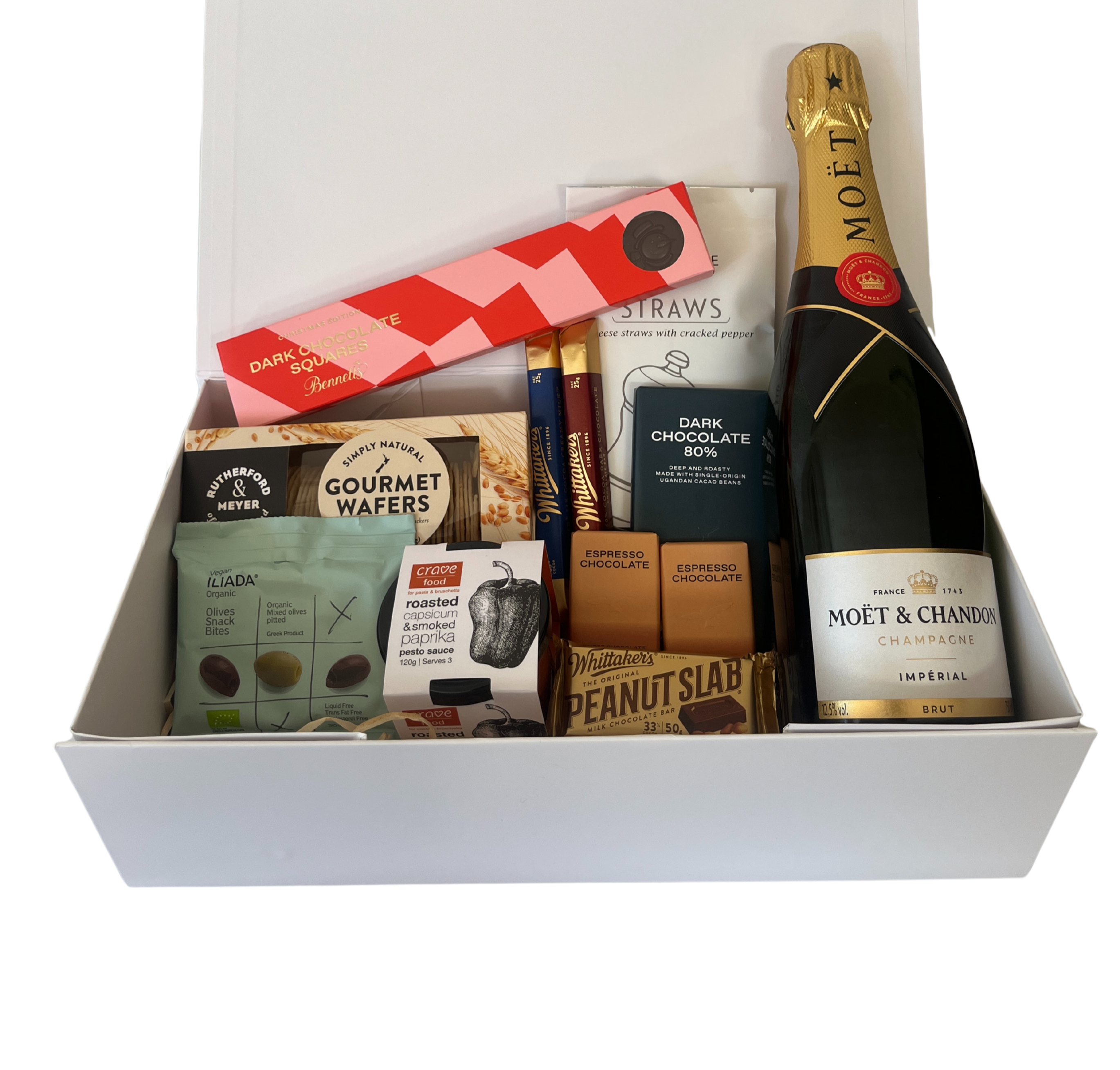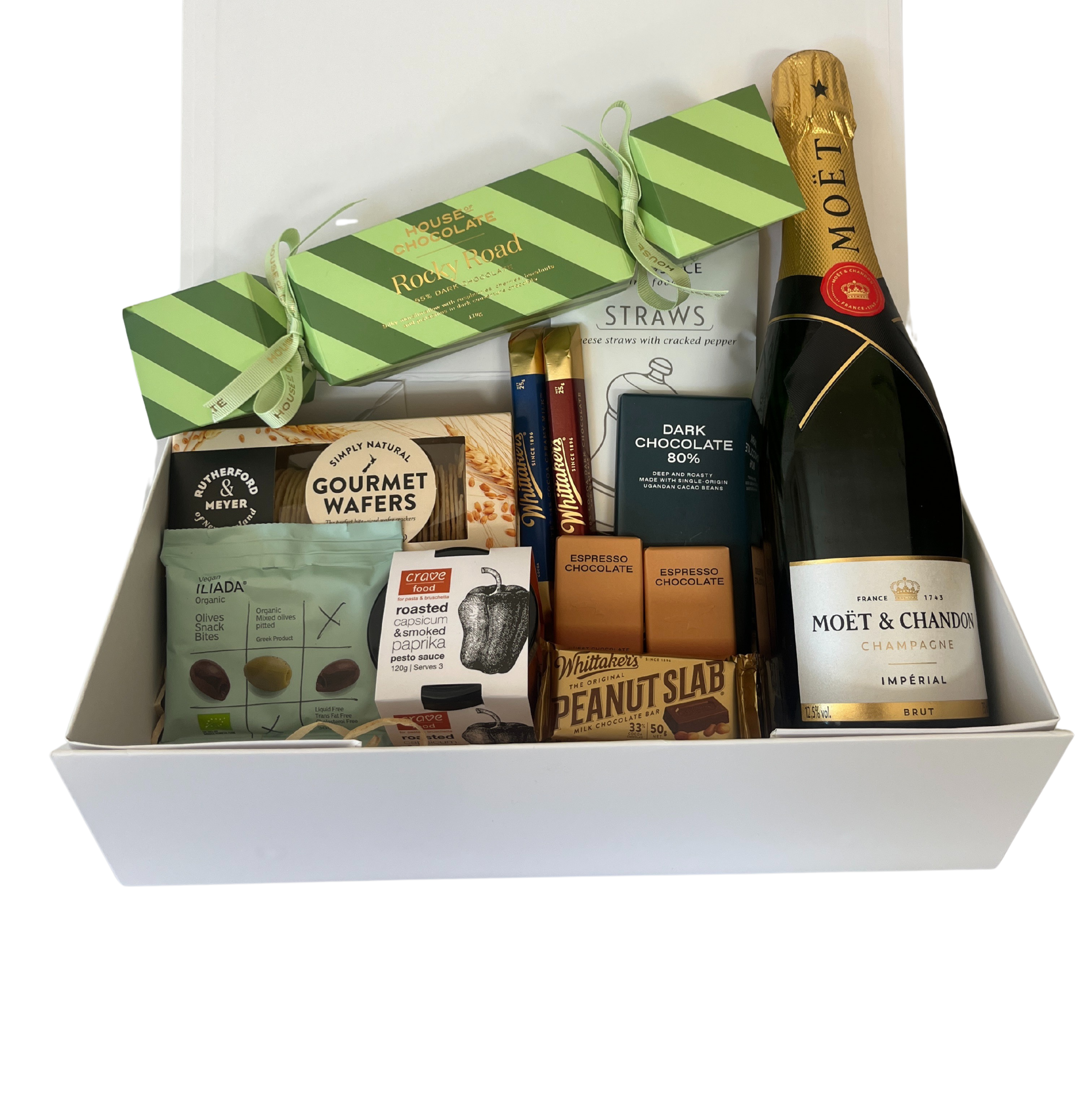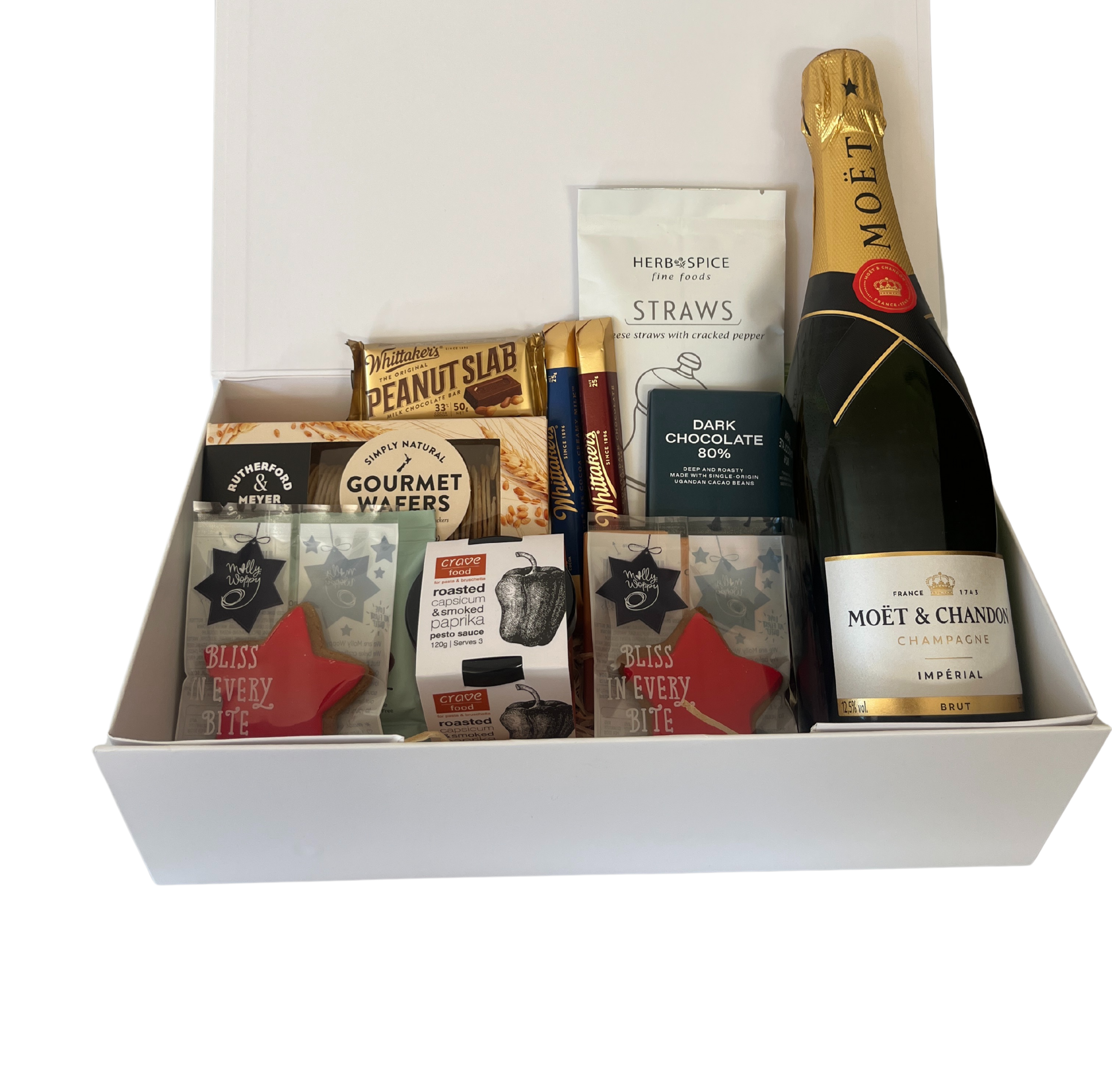 Dive into an exquisite gift box experience from NZ, featuring the luxurious Moët & Chandon Champagne, harmoniously paired with handpicked gourmet treats. This gift basket showcases Bennetts of Mangawhai chocolate, savoury bites and more. Ideal for any celebration, our curated gift boxes NZ collection ensures a taste of opulence and delight.