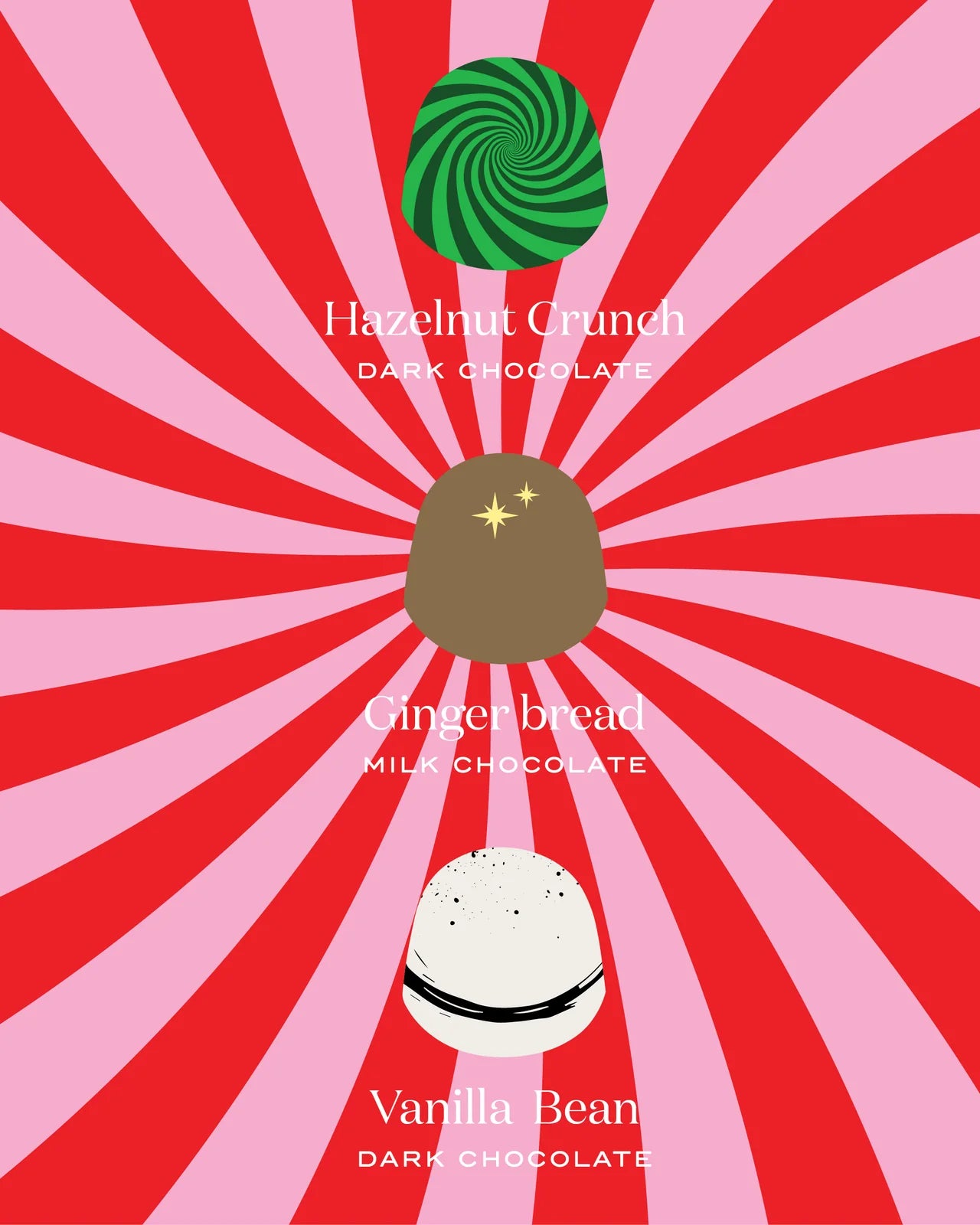 Three Handcrafted Festive Bonbons. Taste our mini but mighty selection of three limited edition Christmas flavours, inspired by festive and Kiwi summer ingredients.